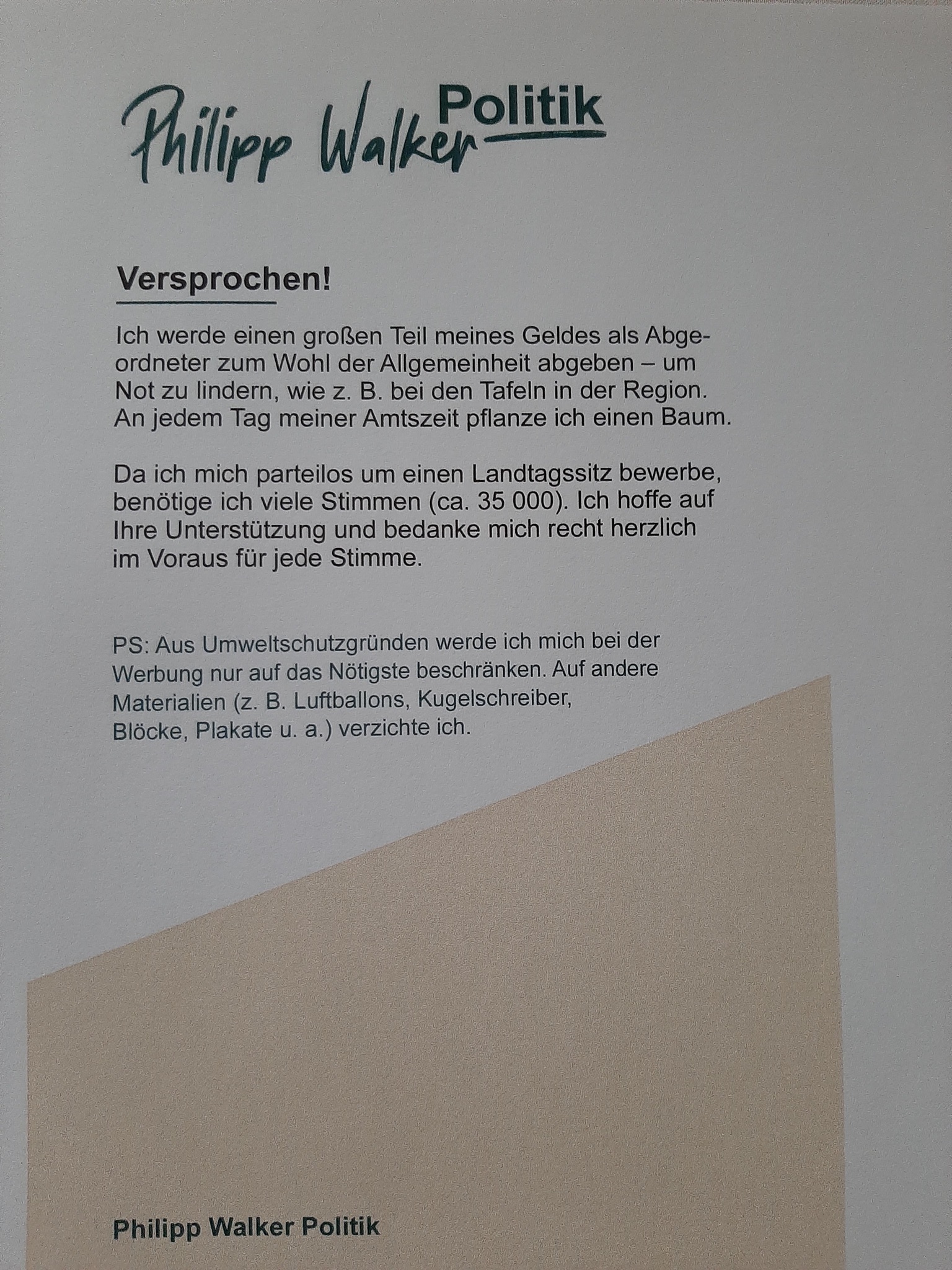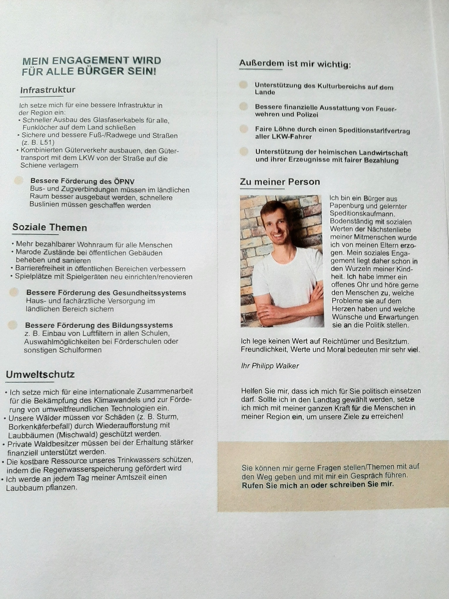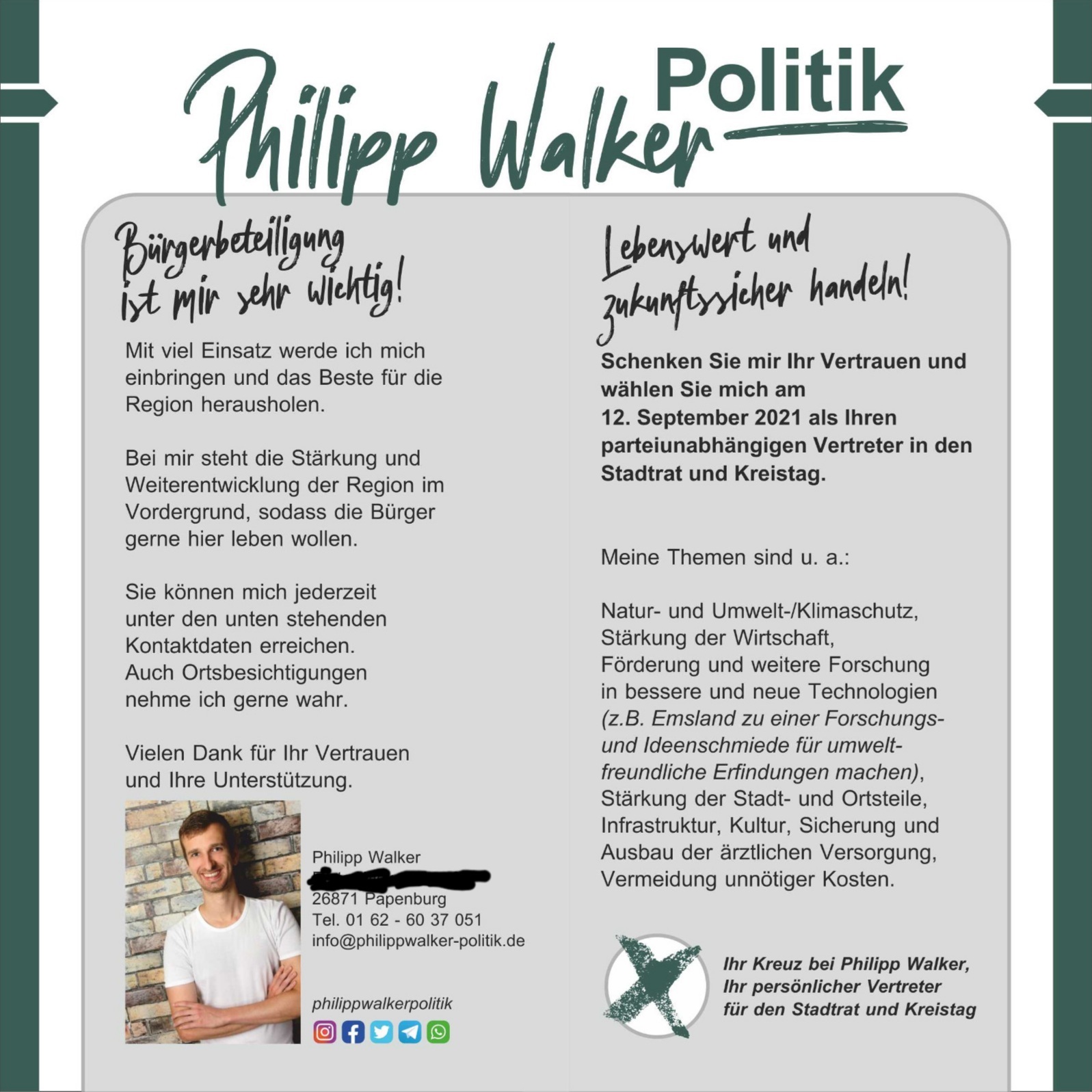 Für Ideen, Anliegen, Verbesserungsvorschläge und Anfragen bin ich immer offen. Sie können einfach mit dem Kontakt oder per E-Mail unter info@philippwalker-politik.de, oder persönlich/per Telefon 01626037051 mit mir Kontakt aufnehmen. Der Dialog mit Ihnen ist mir sehr wichtig, deswegen nehme ich mir sehr gerne die Zeit für Sie.